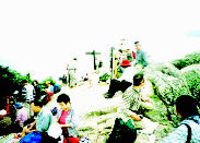| 午前10時54分山頂へ 大きく右に回り込むと梯子が二つ。 これを越すとひょっこり頂上に出た。 平日にも関わらず山頂は人でいっぱい。 ガスが目の前を流れ 一面真っ白で展望なし (^ ^ ;;; |