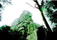 大ヤスリ岩 梯子あり、ロープあり、岩に掴まり木の根をつかみ、 歩くというより、よじ登るといった感じで急登を喘ぐ。 山頂近くになるとそそり立つ巨大な岩が眼前に迫ってくる。 |